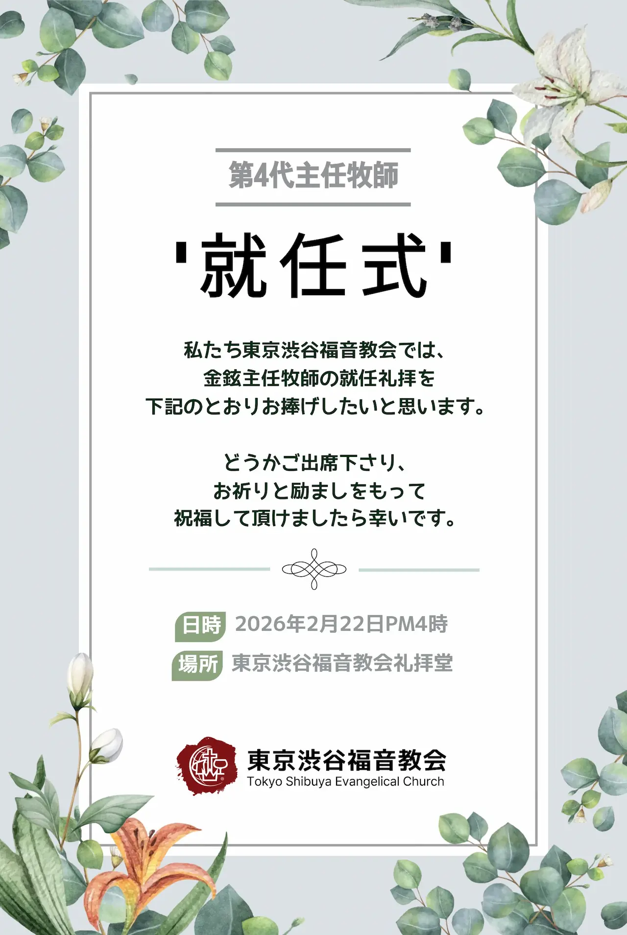 2026-02-15(日) - 1部主日礼拝(日本語)10:30AM、2部主日礼拝(韓国語)1:00PM